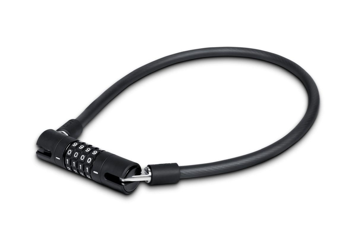 extra sicheres Kabelschloss, CORE+ verstärktes und flexibles Stahlkabel, GRIP+ vollständig gummierte Oberflächen, EASY WING 180° rotierbare Kabelanbindung, Kabel und Schlosskörper korrosionsgeschützt, Kunststoffcover schützen den Rahmen vor Kratzern, geprüft auf mechanische Festigkeit, schadstoffarm zertifiziert, frei einstellbarer Zahlencode