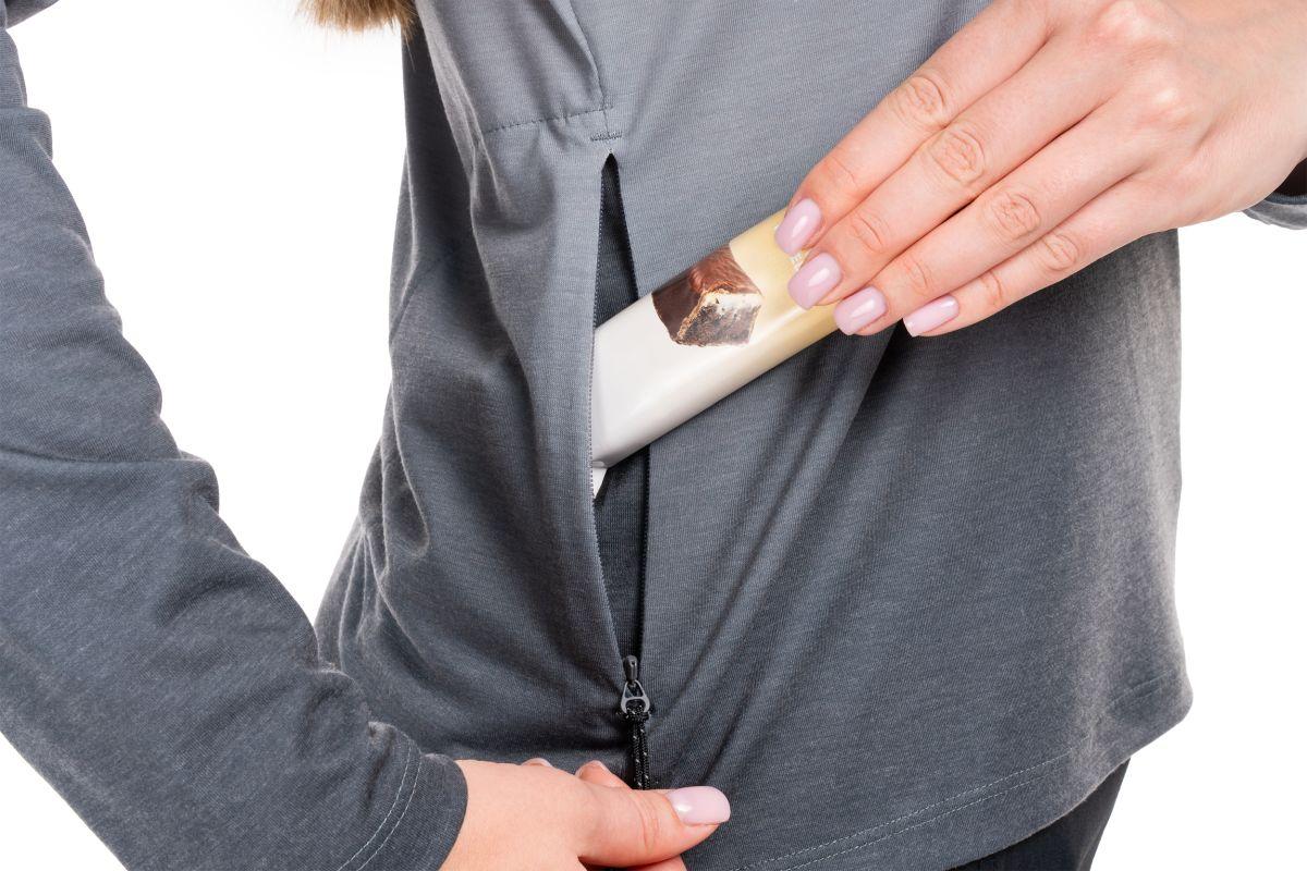 atmungsaktives, schnelltrocknendes Funktionsmaterial mit Baumwollhaptik, Tasche mit Reißverschluss hinten, dezenter Druck, Model ist 168 cm groß, Model trägt Größe S