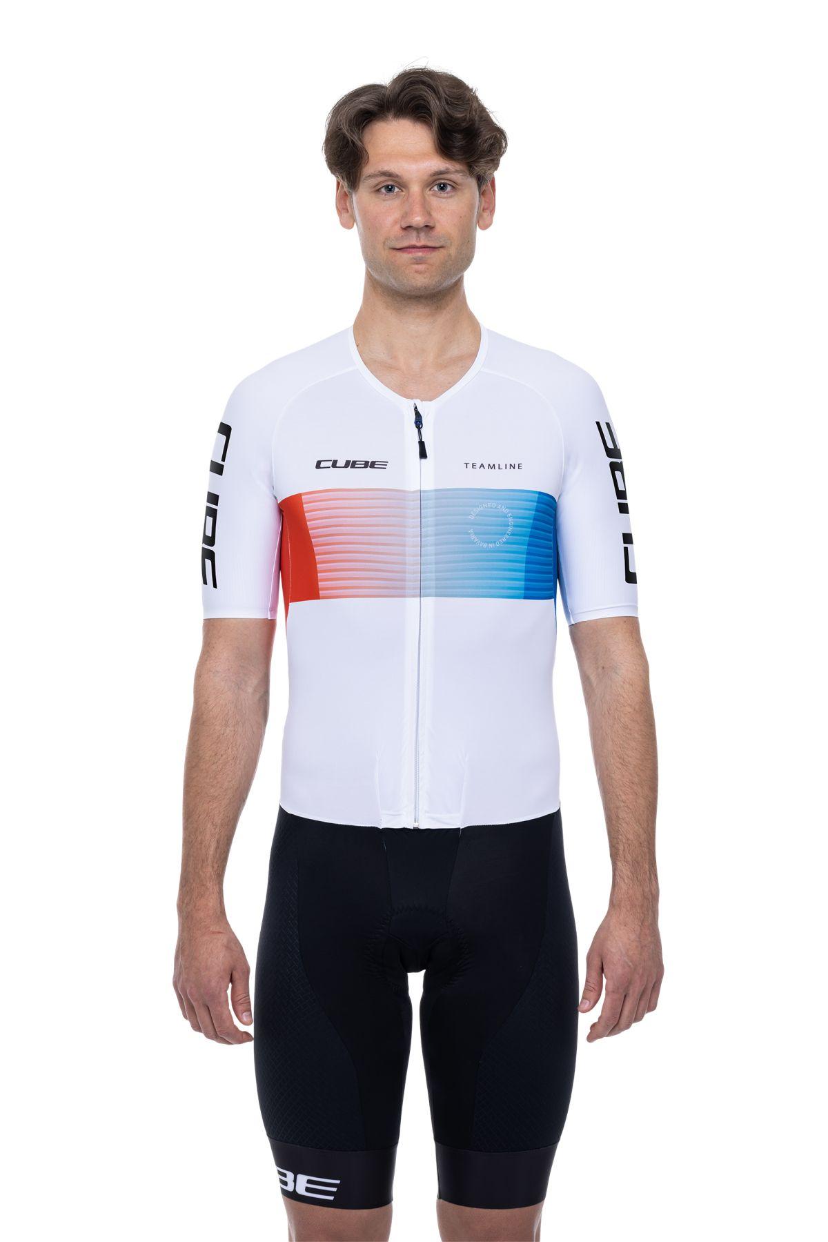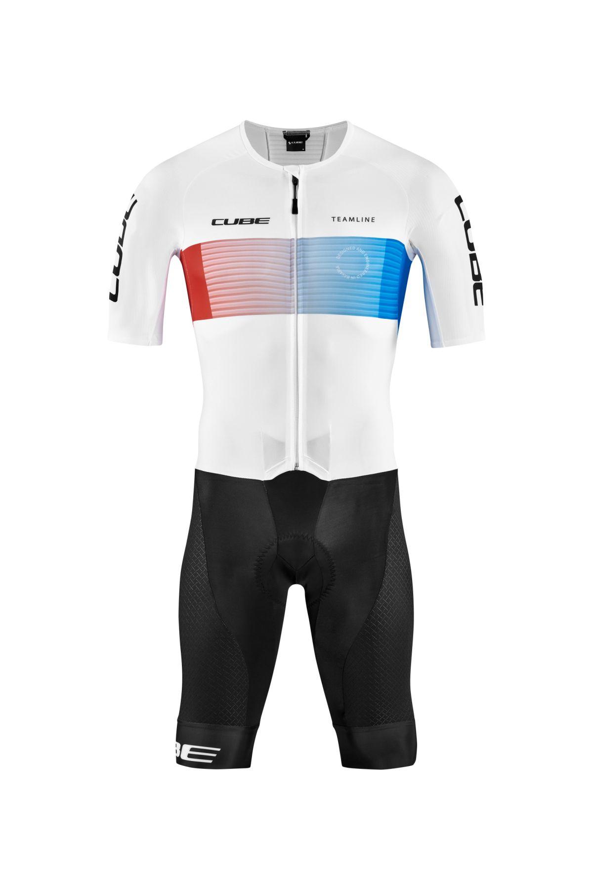 Renneinteiler für cross country, atmungsaktiv und schnelltrocknend, robuster, widerstandsfähiger Materialmix, 3-teilige Rückentasche, CUBE Team Pad - hergestellt in Italien, Model ist 190cm groß, Model trägt Größe L