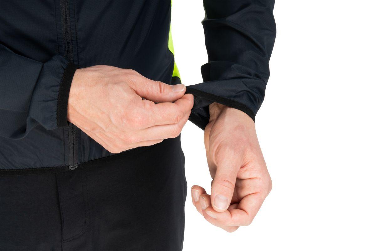 enganliegender Kragen für extra Windschutz, winddicht und wasserabweisend, geringes Packmaß, in sich selbst verstaubar, reflektierende Elemente, elastischer Saum, Model ist 178 cm groß und trägt Größe M