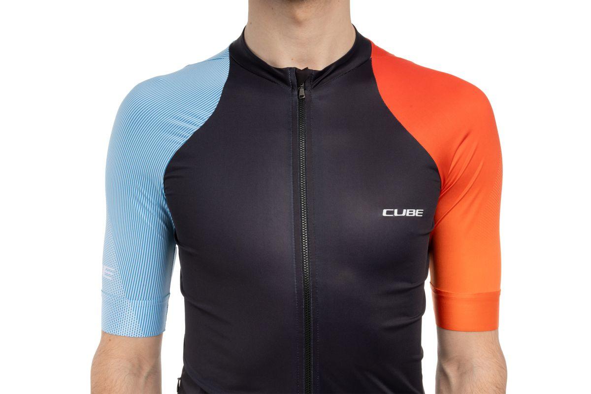 Das CUBE Road/XC Kurzarmtrikot verbindet sportlichen Schnitt mit cleveren Details. Der athletische Sitz bietet im Schulterbereich viel Bewegungsfreiheit und sorgt für ein natürliches Tragegefühl auf dem Bike. Der durchgehende Frontreißverschluss macht das An- und Ausziehen besonders einfach. Ein silikonbedruckter Saum und der vorgeformte Kragen halten das Trikot sicher an Ort und Stelle und schützen zuverlässig vor Zugluft. In der dreiteiligen Rückentasche finden Verpflegung und Tools Platz, während eine seitlich versteckte, wasserdichte Zipper-Tasche Wertsachen wie Smartphone oder Geld sicher verwahrt.
